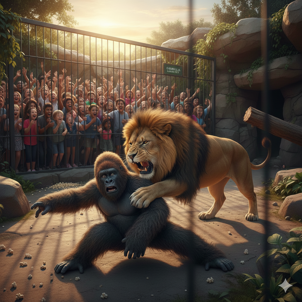 有个失业的哑剧演员在动物园门口卖艺,想讨口饭吃。结果园长找上了他,愁眉苦脸地说:“兄弟,我们这儿的大猩猩刚去世,那可是我们的明星项目!你能不能穿上这身皮,客串一下大猩猩?直到我们买到新的为止。”哑剧演员心想:这不就是本行吗?于是他爽快地答应了。进了笼子他发现,这活儿简直太爽了!他可以随心所欲地睡觉、翻跟头,甚至还能对着游客做鬼脸。观众比他演哑剧时多出好几倍,他的成就感爆棚。直到有一天,他发现隔壁笼子里的狮子抢了他的风头。游客们全围在那边看狮子咆哮。为了保住饭碗,演员决定“卷”起来。他爬上笼顶,越过隔板,把自己悬挂在狮子笼的正上方,对着狮子做各种挑衅的动作。狮子气得暴跳如雷,观众们看得热血沸腾,掌声雷动。然而,就在他得意忘形的时候,手一滑——“扑通”一声,他掉进狮子笼里了!演员魂飞魄散,在笼子里拼命狂奔,狮子在后面紧追不舍。眼看就要被追上了,演员吓得忘了自己是在“扮演”猩猩,放声大喊:“救命啊!杀人啦!救命!”说时迟那时快,狮子一个猛虎下山把他扑倒在地,压在他身上,在他耳边低声吼道:“闭嘴,你个蠢货!你想让我们两个都丢饭碗吗?”